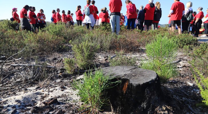 O ponto de encontro dos caminhantes ocorreu no parque de merendas da Portela, de onde os mais de 50 participantes partiram em direção ao talhão 258 do Pinhal do Rei, que foi reflorestado em 2018 pelo movimento rotário e por dezenas de voluntários de vários pontos do país, através da plantação de 50 mil árvores.