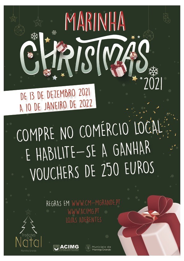 A Câmara Municipal da Marinha Grande e a ACIMG - Associação Comercial e Industrial da Marinha Grande vão realizar a campanha “Marinha Christmas 2021”, entre 13 de dezembro e 10 de janeiro de 2022, para incentivar e dinamizar o comércio local, no âmbito do programa de animação “Tradições de Natal 2021”.