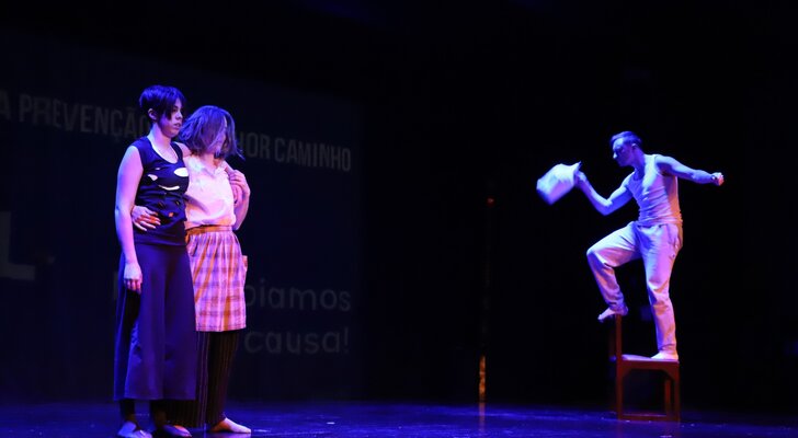 No espetáculo “Abril Azul”, foram apresentadas performances de dança e teatro, pelos alunos do SOM, que evocaram os sinais de alerta relativos à violência nas famílias e no namoro.