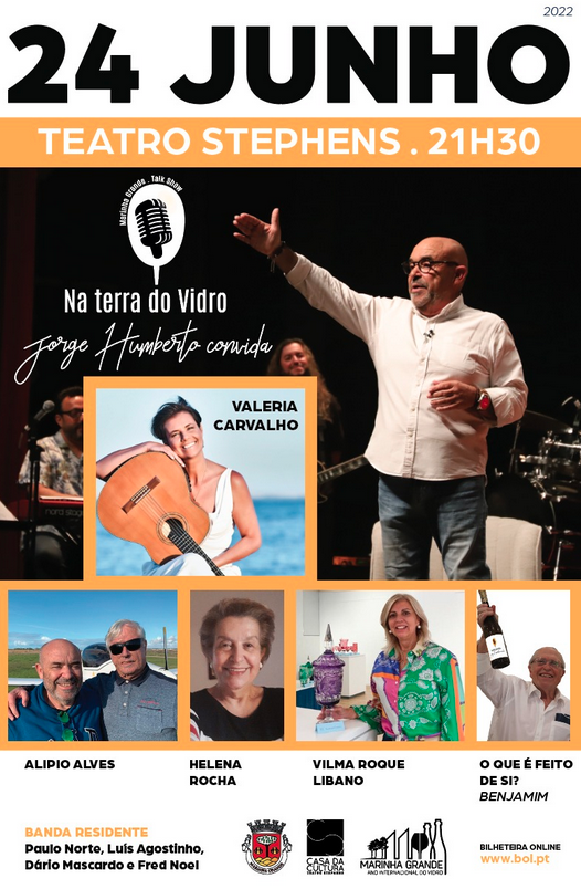 A atriz, cantora e compositora brasileira Valéria Carvalho é a convidada principal do segundo Talk Show “Na Terra do Vidro, Jorge Humberto convida”, que se realiza no dia 24 de junho (sexta-feira), pelas 21h30, na Casa da Cultura Teatro Stephens, na Marinha Grande.