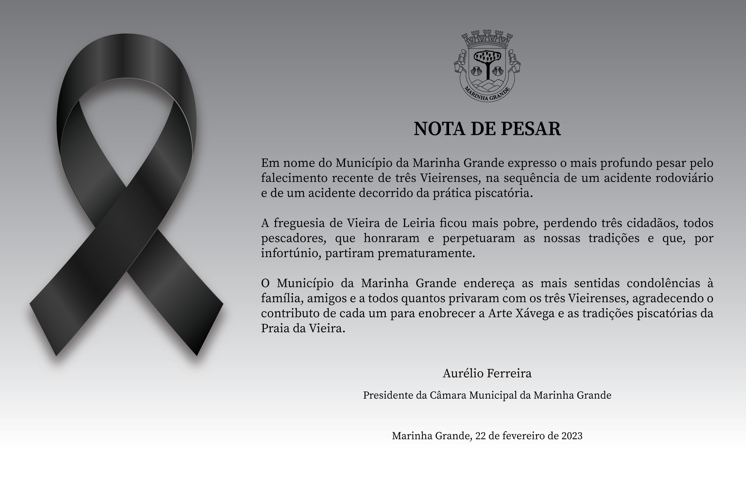 Em nome do Município da Marinha Grande expresso o mais profundo pesar pelo falecimento recente de três Vieirenses, na sequência de um acidente rodoviário e de um acidente decorrido da prática piscatória.