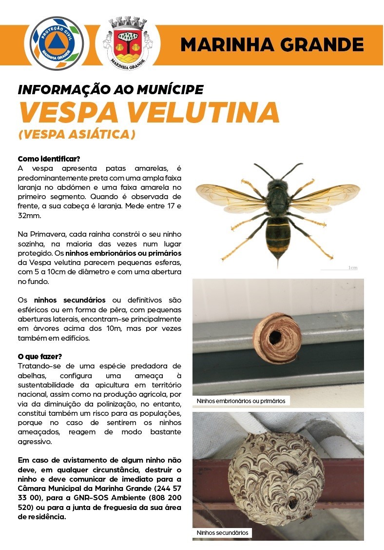 O Serviço Municipal de Proteção Civil informa a população que, nesta altura do ano, a vespa asiática (Vespa velutina) está mais ativa, razão pela qual se tem registado, no último mês, um aumento significativo do número de avistamentos de ninhos de vespa asiática no concelho da Marinha Grande.