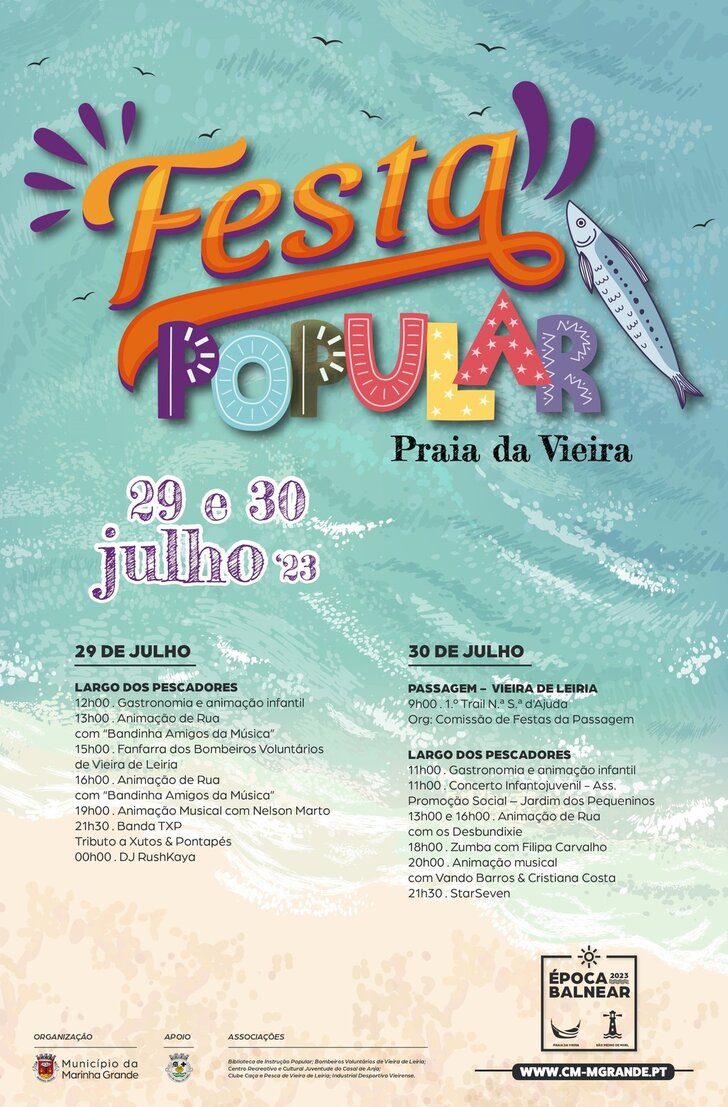 A Praia da Vieira, no concelho da Marinha Grande, recebe a Festa Popular, nos dias 29 e 30 de julho, com sardinhada, tasquinhas, espetáculos e muita animação para toda a família, que decorrem no Largo dos Pescadores.