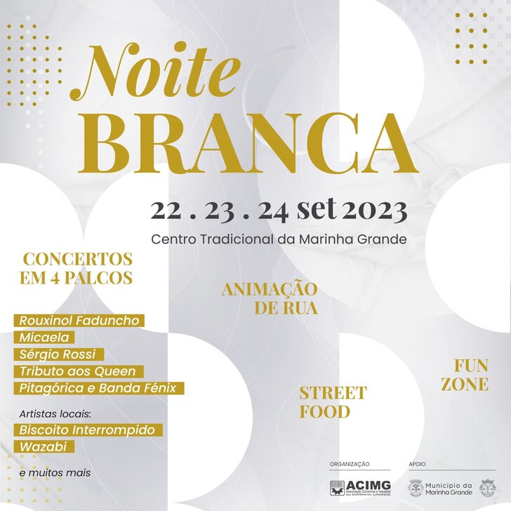 O centro da Marinha Grande irá, assim, vestir-se de branco, numa iniciativa onde haverá animação de rua, fun zone e também street food. A organização do evento está a cargo da ACIMG, com o apoio da Câmara Municipal da Marinha Grande; as duas entidades associam-se, deste modo, para trazer aos marinhenses uma noite repleta de muita música, gastronomia e diversão.