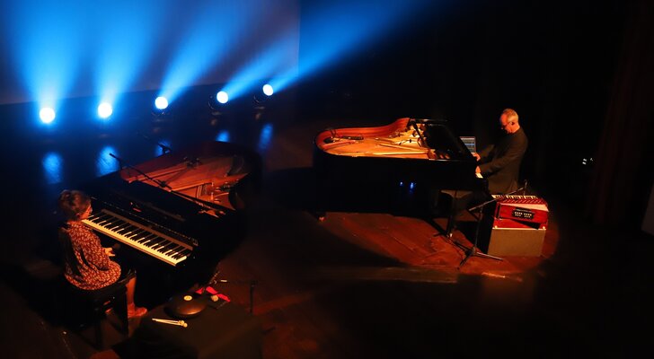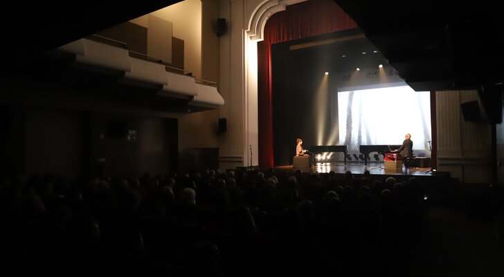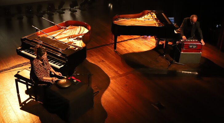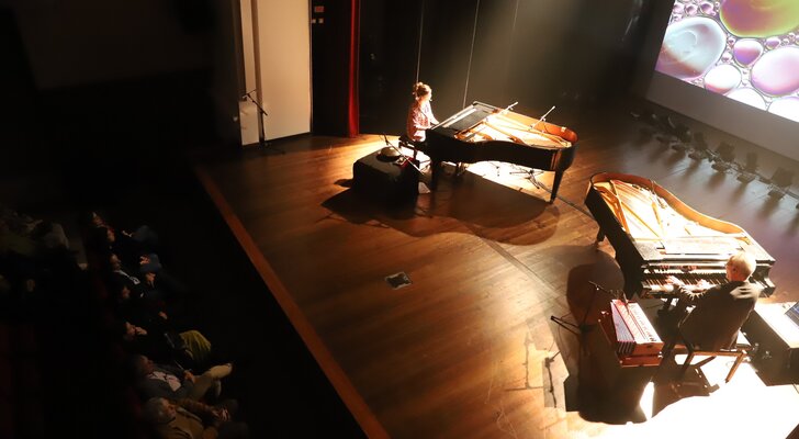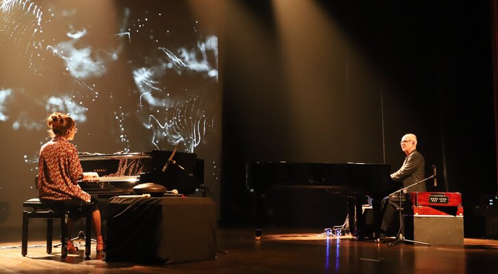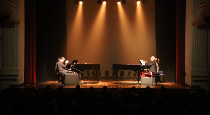 Em palco, os músicos ocuparam os dois pianos e tocaram outros instrumentos, cujas sonoridades se juntaram aos sintetizadores, em temas do novo disco, como Pandu, Rodant, Jagoz, Marzar, Irmãs ou o incontornável e já bem conhecido Tardes de Bolonha, ali interpretado apenas ao piano.