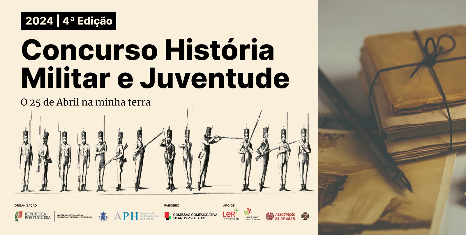 O Concurso "História Militar e Juventude 2024" tem como tema da 4ª edição “O 25 de Abril na minha terra”. É um concurso promovido pela APH e pela CPHM. Mais uma vez, conta com a Comissão Comemorativa dos 50 anos do 25 de Abril como parceira e com o PNL2027, a Assoc. Municípios Portugueses, a Assoc.25 de Abril e a Liga dos Combatentes como apoios.