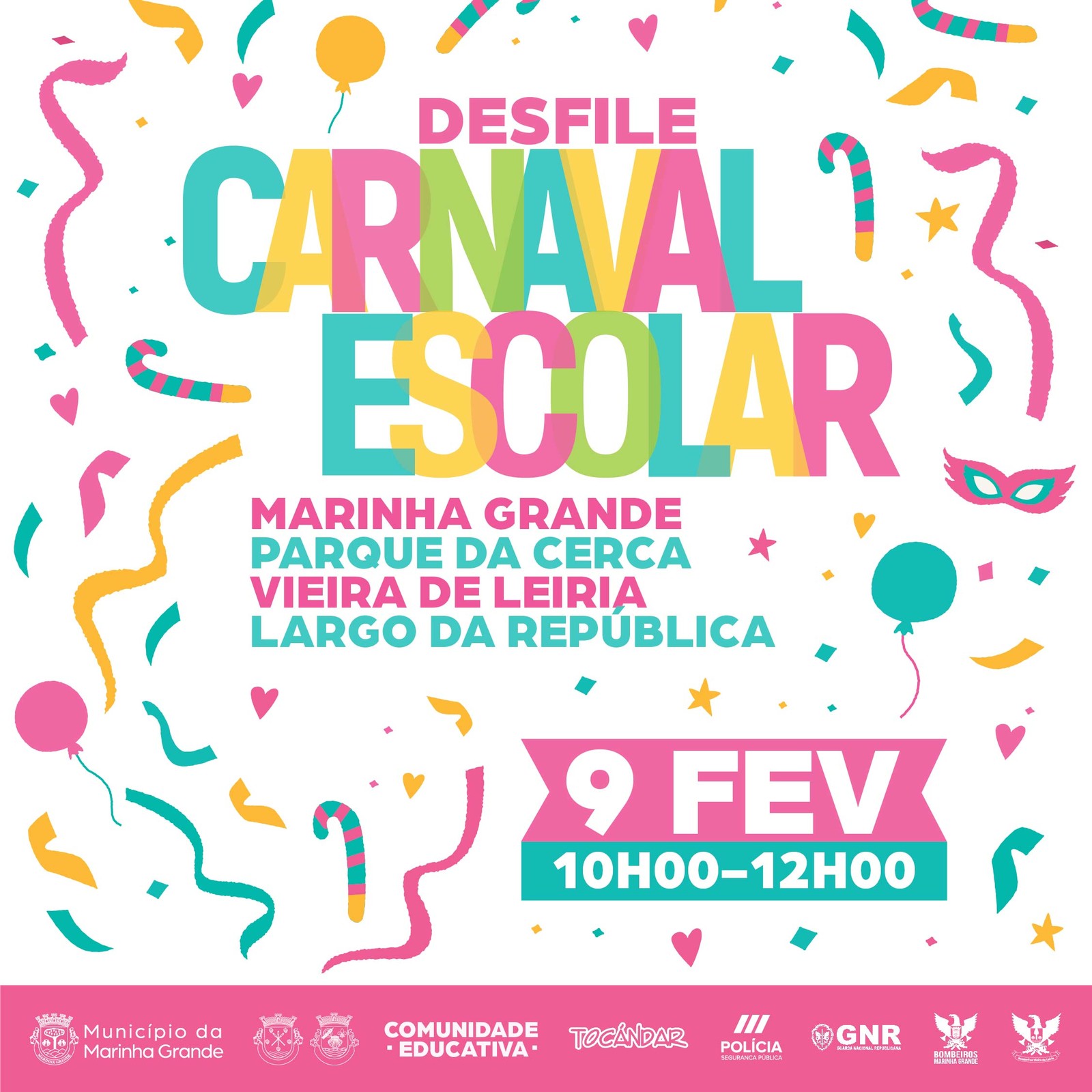 Na Marinha Grande, o desfile de Carnaval tem início às 10h00. Este ano, o itinerário será alterado, de modo a garantir maior segurança dos participantes, com delimitação das zonas para uma melhor observação do corso, pelo que o Município apela à colaboração do público para respeitar os locais definidos para o efeito.