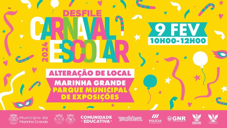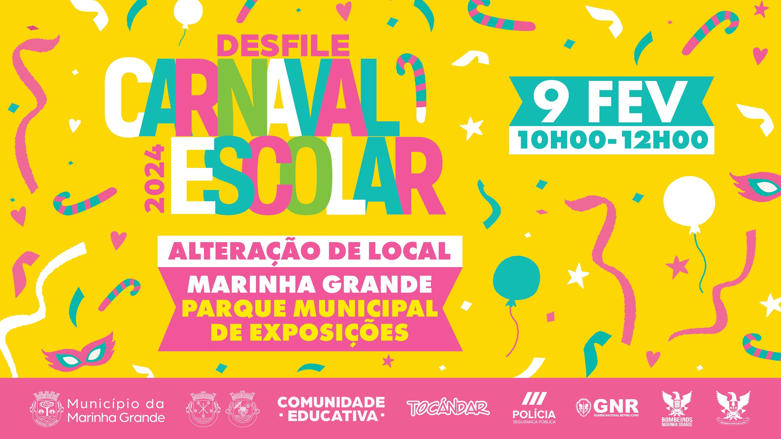 Devido à previsão de condições climatéricas adversas, o Desfile de Carnaval das Escolas da Marinha Grande irá realizar-se no Parque Municipal de Exposições, no dia 9 de fevereiro, das 10h00 às 12h00.