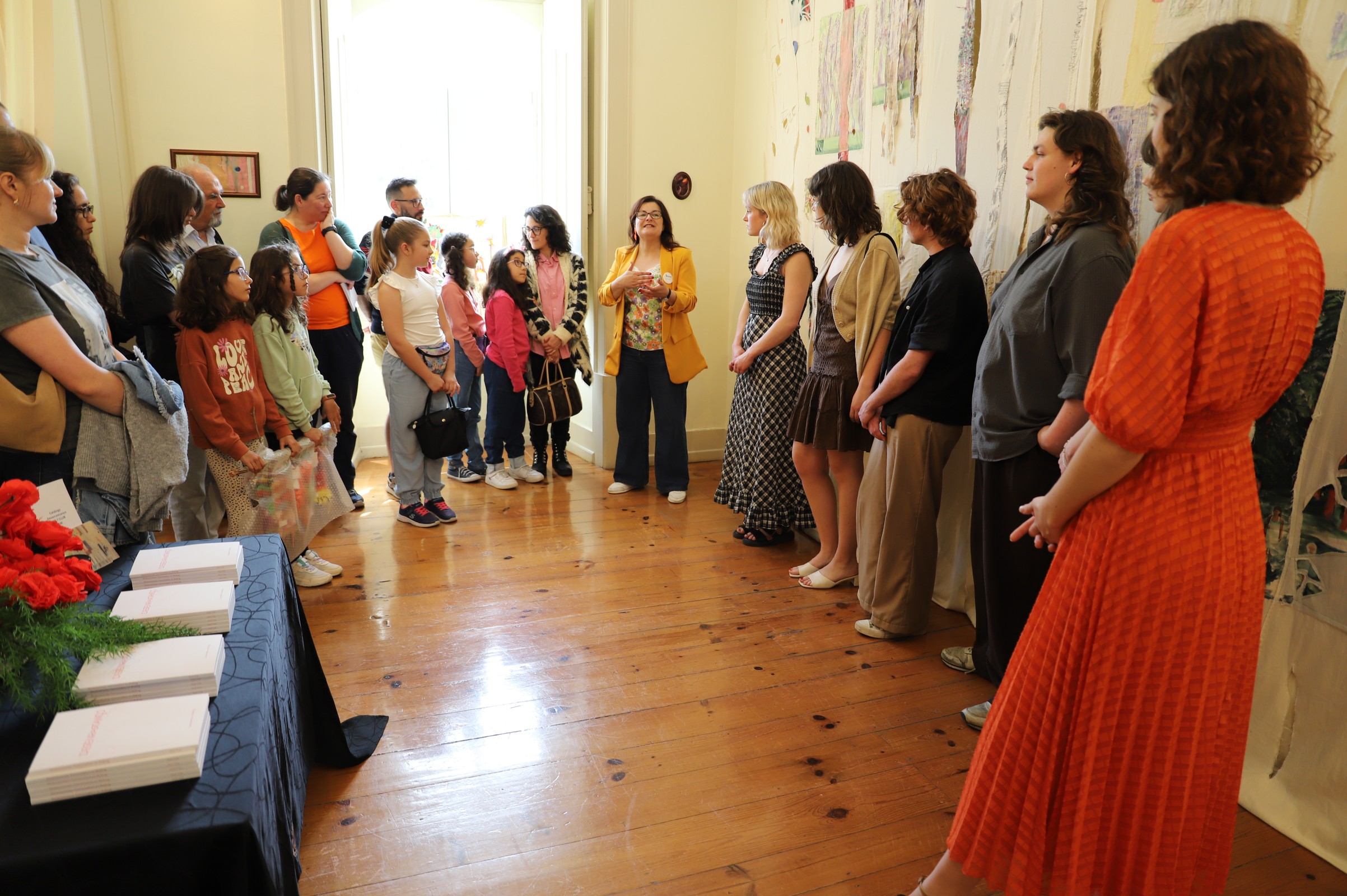 A técnica do Museu, Cátia Cavaco, e seis dos oito artistas, explicaram o âmbito da exposição, que está patente desde o dia 1 de dezembro e que agora finda, bem como as oficinas pedagógicas, realizadas nos Museus da Marinha Grande, durante a semana passada, que envolveram escolas do concelho e utentes da APPACDM e resultaram na instalação “Uma floresta de tecido”.