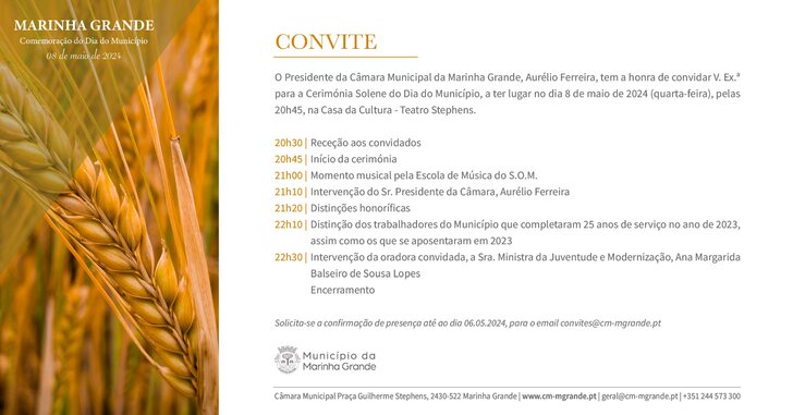 A Câmara Municipal da Marinha Grande vai comemorar o Dia do Município (Quinta-Feira da Ascensão), no próximo dia 8 de maio, pelas 20h45, no Teatro Stephens, na véspera de feriado municipal, numa cerimónia solene que incluirá distinções honoríficas.