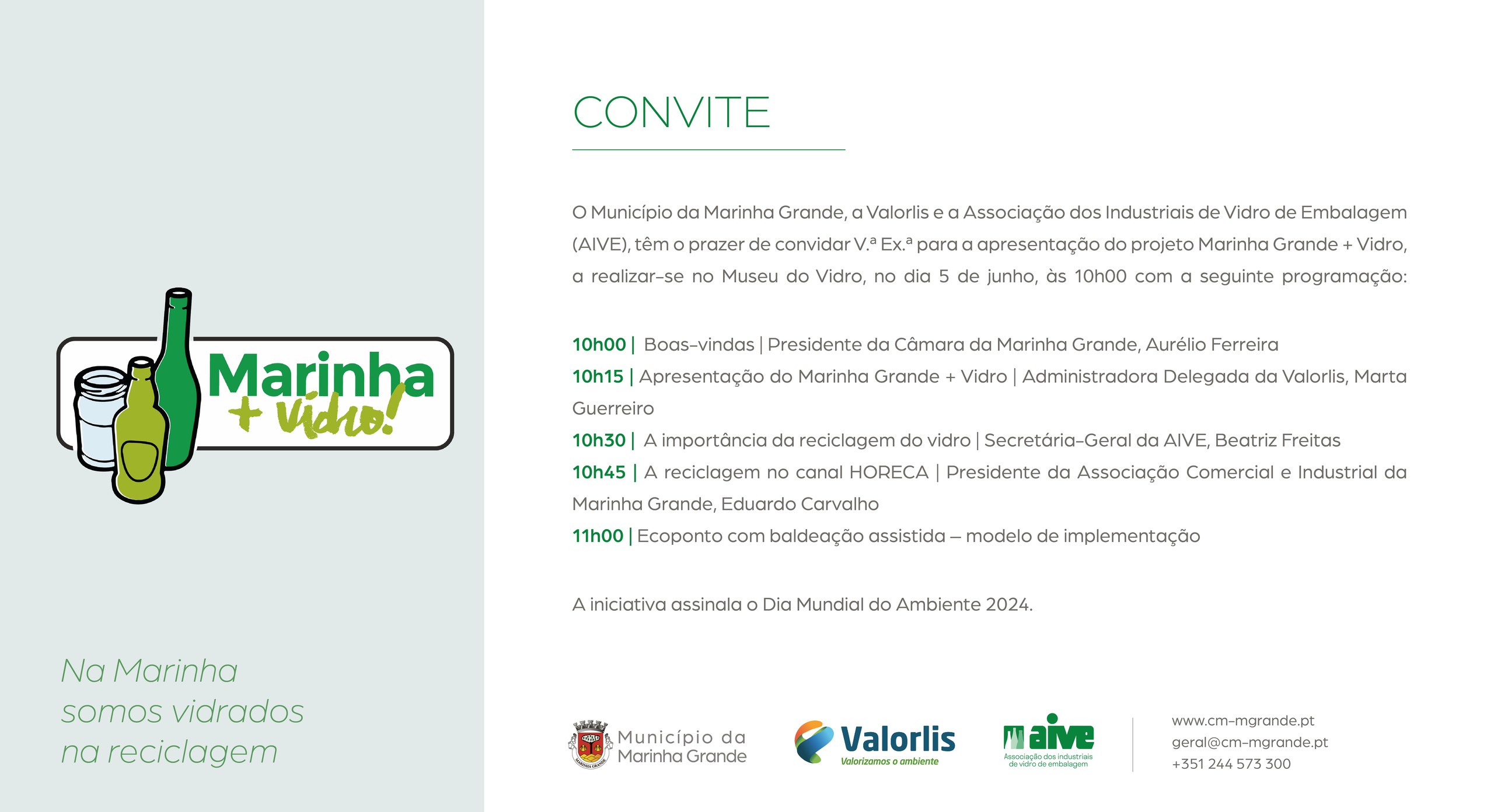 O Município da Marinha Grande, em parceria com a Valorlis e a AIVE (Associação dos Industriais de Vidro de Embalagem), vai comemorar o Dia Mundial do Ambiente com a apresentação pública do projeto “Marinha Grande + Vidro”, que decorrerá no dia 5 de junho, às 10h00, no Museu do Vidro.