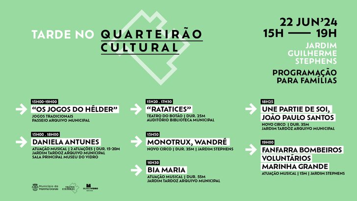 O Património Stephens, situado no centro tradicional da Marinha Grande, recebe a segunda edição do Quarteirão Cultural, no próximo dia 22 de junho (sábado), das 15h00 às 19h00. A iniciativa é direcionada a famílias que poderão fruir de atividades ligadas à música, teatro, novo circo, exposições, jogos tradicionais e animação infantil.