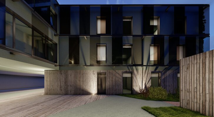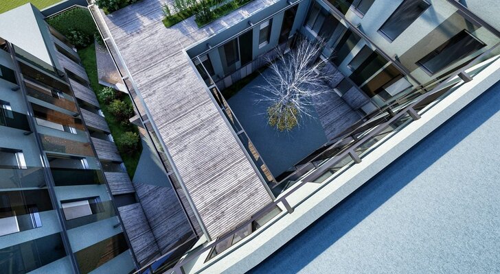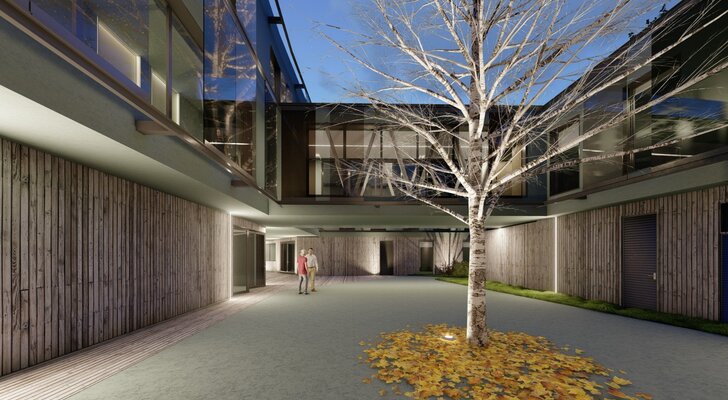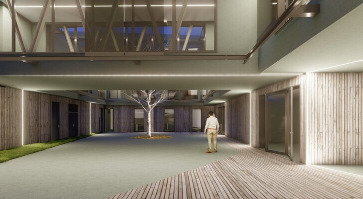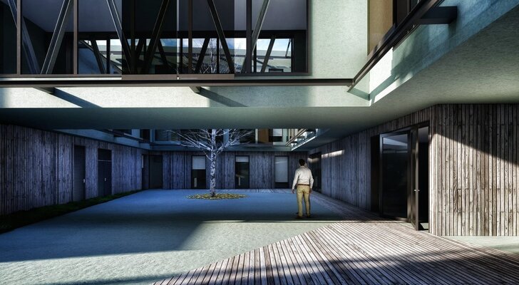 Em relação à forma do edificado proposto, o conceito que se procurou estabelecer foi algo que potenciasse o convívio social entre os residentes e também criasse um espaço interno visitável pela comunidade, como um amplo espaço de receção ao ar livre. O projeto desenvolve-se em volta de um pátio interno, aberto à comunidade, acessível pela Rua Alexandre Herculano.