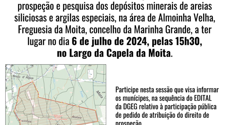 O Município da Marinha Grande e a Junta de Freguesia da Moita convidam a população a participar na sessão de esclarecimentos sobre a atribuição de direitos de prospeção e pesquisa dos depósitos minerais de areias siliciosas e argilas especiais, na área de Almoinha Velha, Freguesia da Moita, concelho da Marinha Grande, a ter lugar no dia 6 de julho de 2024, pelas 15h30, no Largo da Capela da Moita.