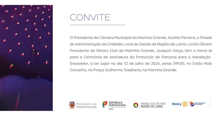 O Município da Marinha Grande, a Unidade Local de Saúde da Região de Leiria e o Rotary Club da Marinha Grande, vão celebrar um Protocolo de Parceria para a instalação de uma Sala de Snoezelen, no dia 12 de julho de 2024, pelas 09h30, no Salão Nobre dos Paços do Concelho, na Praça Guilherme Stephens, na Marinha Grande.