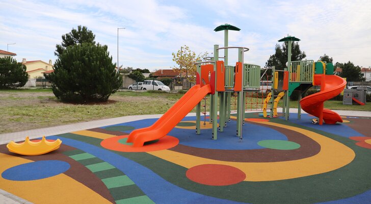 No JI da Amieirinha, o pavimento tem marcados uma macaca e vários elementos gráficos. Estes jogos permitem dinamizar o espaço, ampliar a área destinada à brincadeira e garantir um uso mais dinâmico, transversal e inclusivo de toda a área de intervenção.
