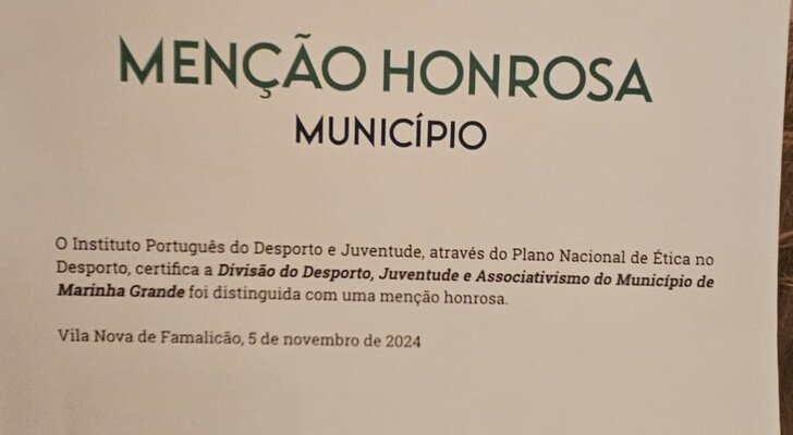 A Câmara Municipal da Marinha Grande recebeu uma Menção Honrosa, entregue por José Lima, coordenador do Plano Nacional da Ética no Desporto, pela adoção de políticas públicas que promovem os valores éticos por via da prática desportiva.