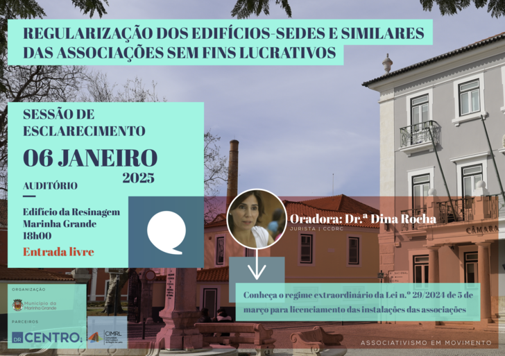 No próximo dia 6 de janeiro de 2025, pelas 18h00, no Auditório do Edifício da Resinagem, na Marinha Grande, terá lugar uma Sessão de Esclarecimento sobre o regime de regularização de edifícios-sede e similares de associações sem fins lucrativos, tendo como oradora a jurista Dina Rocha, da Comissão de Coordenação e Desenvolvimento Regional do Centro (CCDRC).