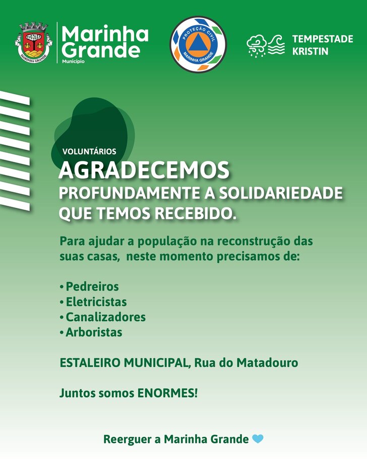 O Município da Marinha Grande informa que, na sequência dos danos provocados pela Tempestade Kristin e no âmbito das ações de recuperação em curso, é prioritária a mobilização de mão‑de‑obra especializada para apoiar a reconstrução das habitações afetadas.