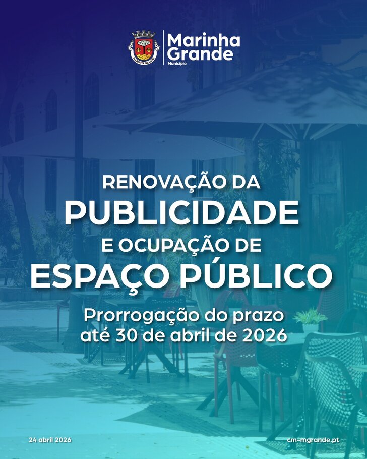 A Câmara Municipal da Marinha Grande prorrogou o prazo para pagamento da taxa de renovação da publicidade e da ocupação de espaço público com equipamento e mobiliário urbano, relativa ao ano de 2026, até ao dia 30 de abril, sem aplicação de juros.