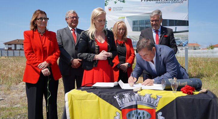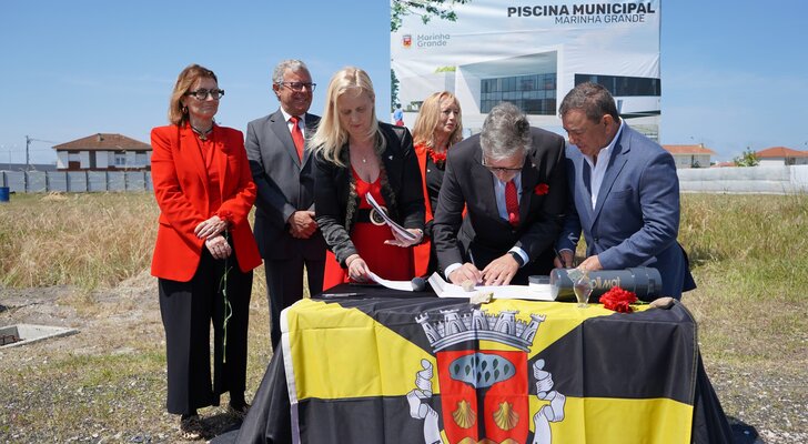 O Município da Marinha Grande assinalou, esta manhã, 25 de abril de 2026, o início oficial da construção da nova Piscina Municipal, com a cerimónia de assinatura do Auto de Consignação da Obra e lançamento da primeira pedra, realizada na Zona Desportiva, ao lado dos campos de ténis.