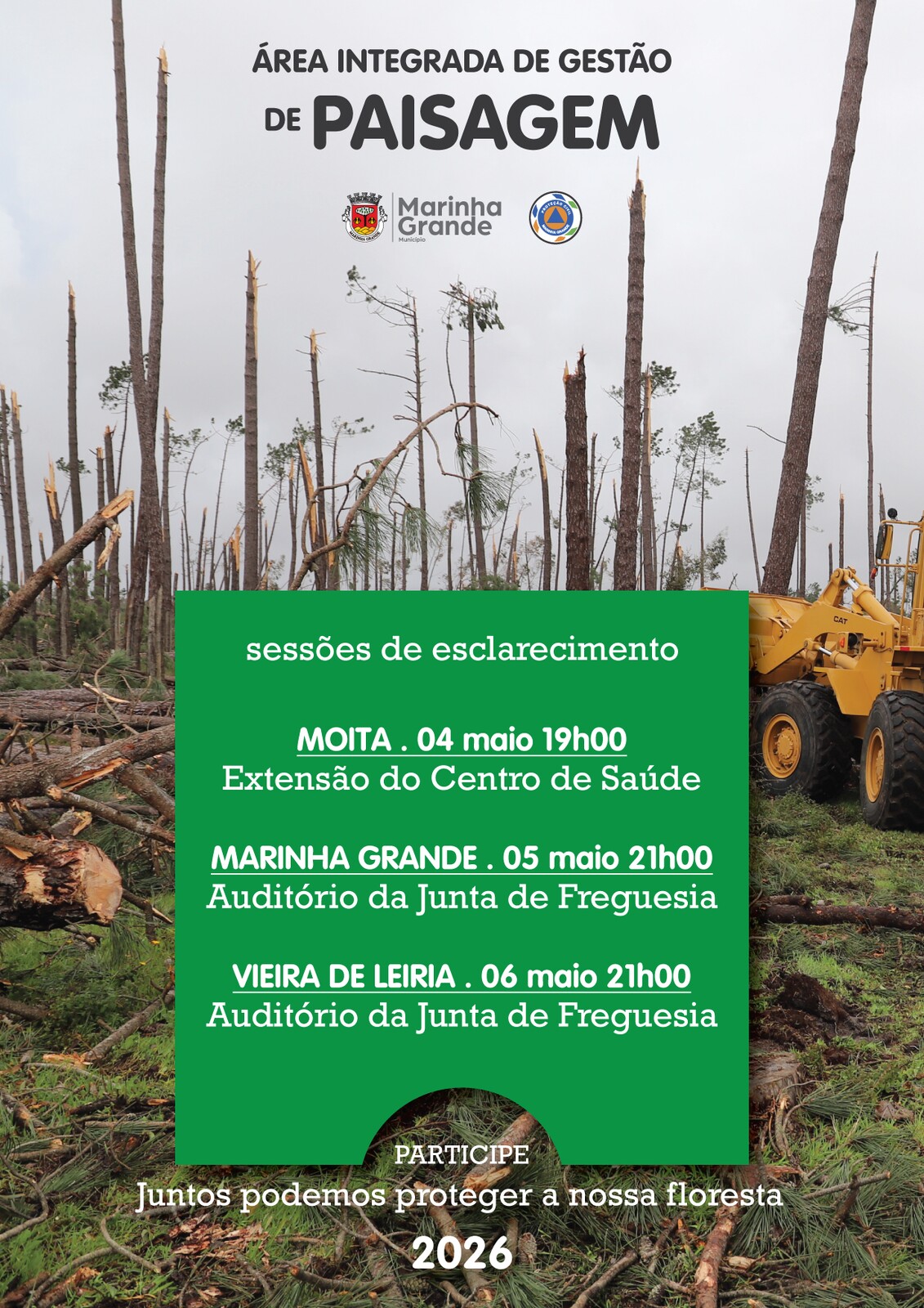 O Município da Marinha Grande informa que se encontra a decorrer, até 12 de maio de 2026, o período de Consulta Pública da Proposta de Operação Integrada de Gestão da Paisagem (OIGP 2.0) da Área Integrada de Gestão da Paisagem (AIGP) da Marinha Grande, um instrumento estratégico destinado a reforçar a resiliência do território florestal, reduzir o perigo de incêndio rural e mitigar os impactos das alterações climáticas.
