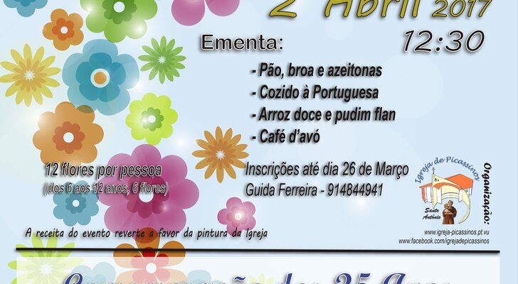 Após as cerimónias realizar-se-á, no salão de festas da Igreja, um almoço-convívio. Da ementa consta pão, broa e azeitonas, Cozido à Portuguesa, arroz doce e pudim flan e cafés d’avó. Com o custo de 12 flores por pessoa, as reservas devem ser feitas até dia 26 de Março junto da Guida Ferreira – 914844941.