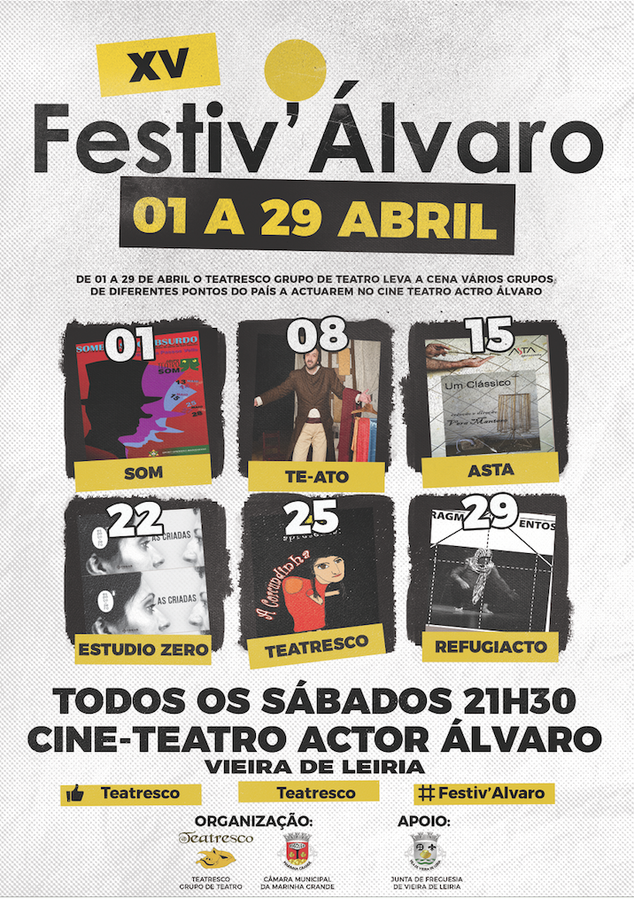 O Teatresco - Grupo de Teatro, em colaboração com a Câmara Municipal da Marinha Grande e a Junta de Freguesia de Vieira de Leiria, promove o XV Festiv' Álvaro, entre os dias 1 e 29 de abril, no Cine-Teatro Actor Álvaro, situado no Largo da República, em Vieira de Leiria.