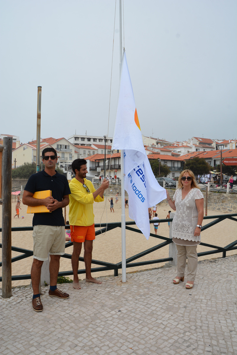 A vice-presidente da Câmara, Cidália Ferreira, e o representante da APA, Edgar Mesquita, acompanhados de um dos nadadores-salvadores de São Pedro de Moel, hastearam a bandeira que confirma a acessibilidade daquela praia, na passada sexta-feira, 4 de agosto.