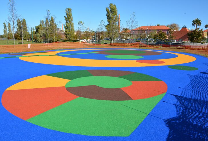As superfícies de impacto estão a ser integralmente substituídas por placas sintéticas com jogos de cores e formas. A drenagem das áreas pavimentadas é assegurada pelas pendentes existentes na base em betonilha que encaminham as águas para as áreas envolventes.
