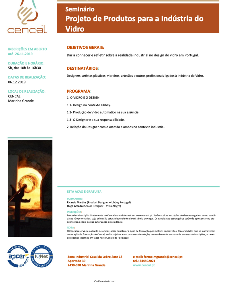 Seminário sobre vidro, que conta com a presença dos designers das duas maiores empresas de vidro de cristalaria da região e de Portugal.