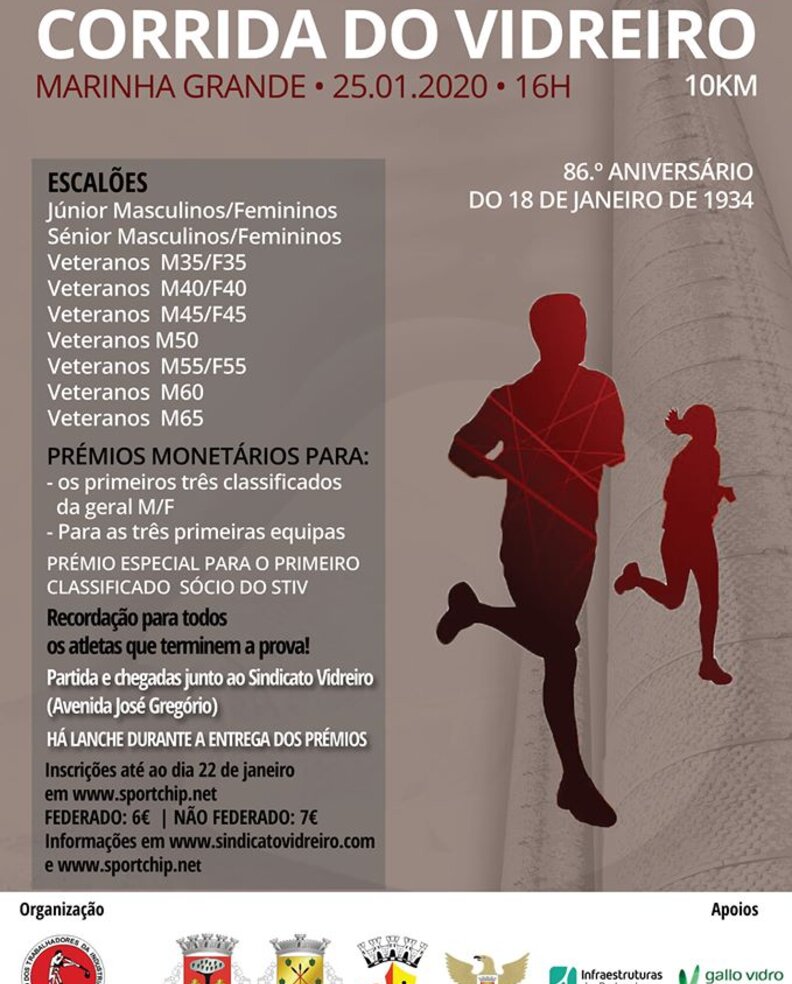 Integrado nas comemorações do 86º Aniversário do 18 DE JANEIRO DE 1934, o Sindicato dos Trabalhadores da Indústria Vidreira com o apoio da Câmara Municipal da Marinha Grande e da Junta de Freguesia da Marinha Grande, vai realizar a prova designada “CORRIDA DO VIDREIRO” no próximo dia 25 de JANEIRO de 2020 pelas 16:00.