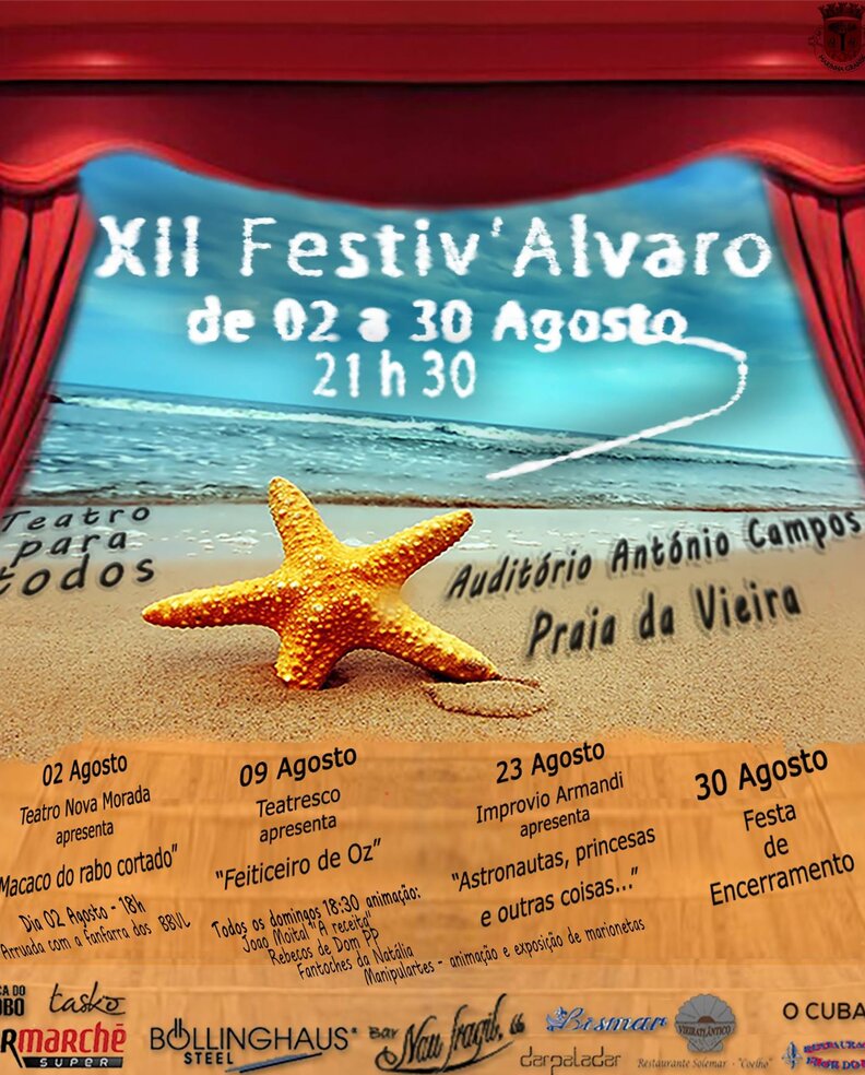 A Praia da Vieira acolhe mais o XII Festiv’ Álvaro – Festival de Teatro, no Auditório António Campos, situado na Avenida dos Pescadores, durante o mês de agosto. A iniciativa é organizada pelo Teatresco - Grupo de Teatro, com o apoio da Câmara Municipal da Marinha Grande.