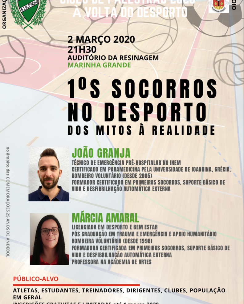 Neste ciclo de palestras 2020 à volta do desporto segue-se a palestra do dia 2 de Março. Esta palestra será sobre "1ºs Socorros no Desporto: dos Mitos à Realidade" com o João Granja e a Márcia Amaral.