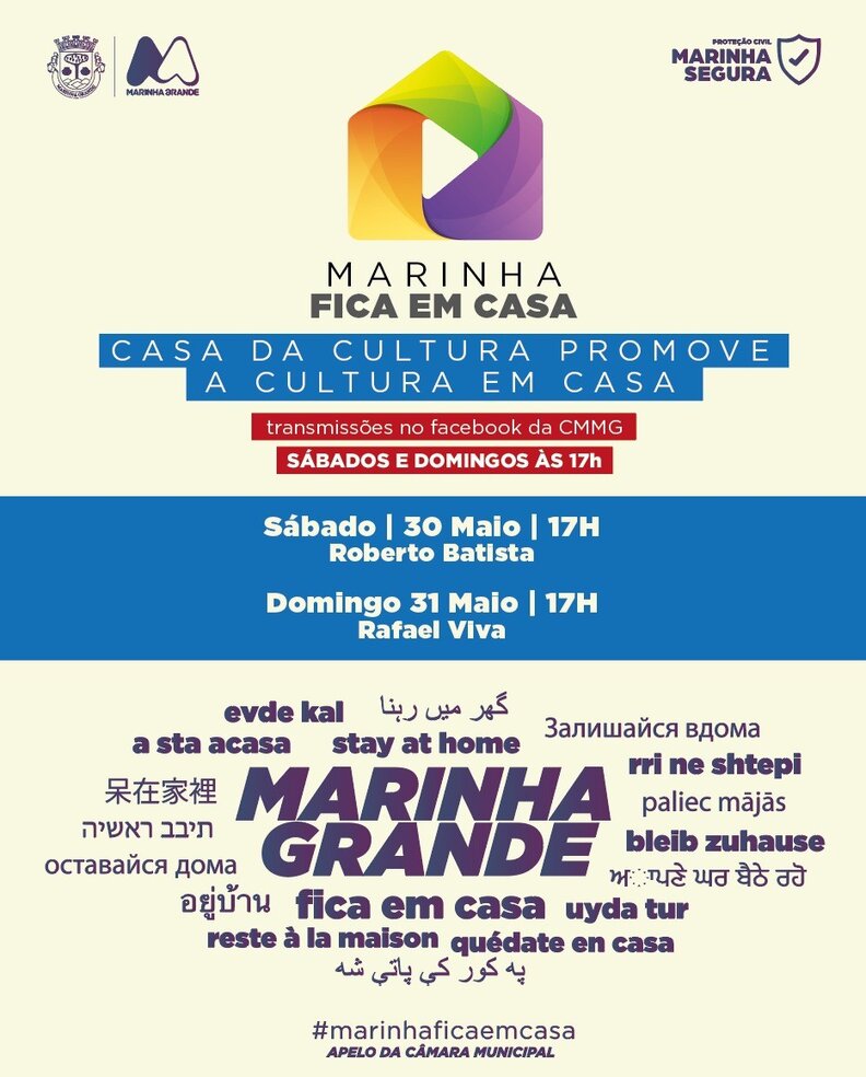 A Câmara Municipal da Marinha Grande vai continuar a transmitir concertos online no âmbito da iniciativa "Casa da Cultura promove a Cultura Em Casa”. Estas iniciativas culturais são difundidas na página de Facebook e do canal do Youtube da Câmara Municipal da Marinha Grande.