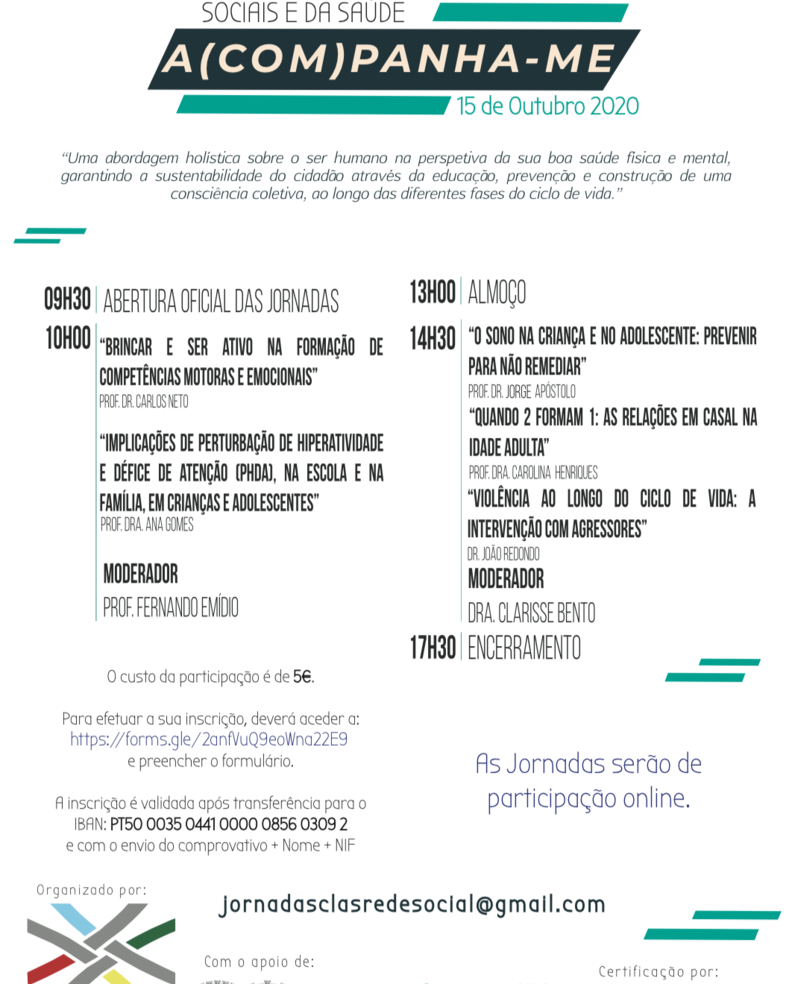 As Jornadas Sociais e da Saúde, da Rede Social da Marinha Grande, terão lugar no próximo dia 15 de outubro de 2020, através de plataforma on-line, conforme cartaz e flyer que segue em anexo.