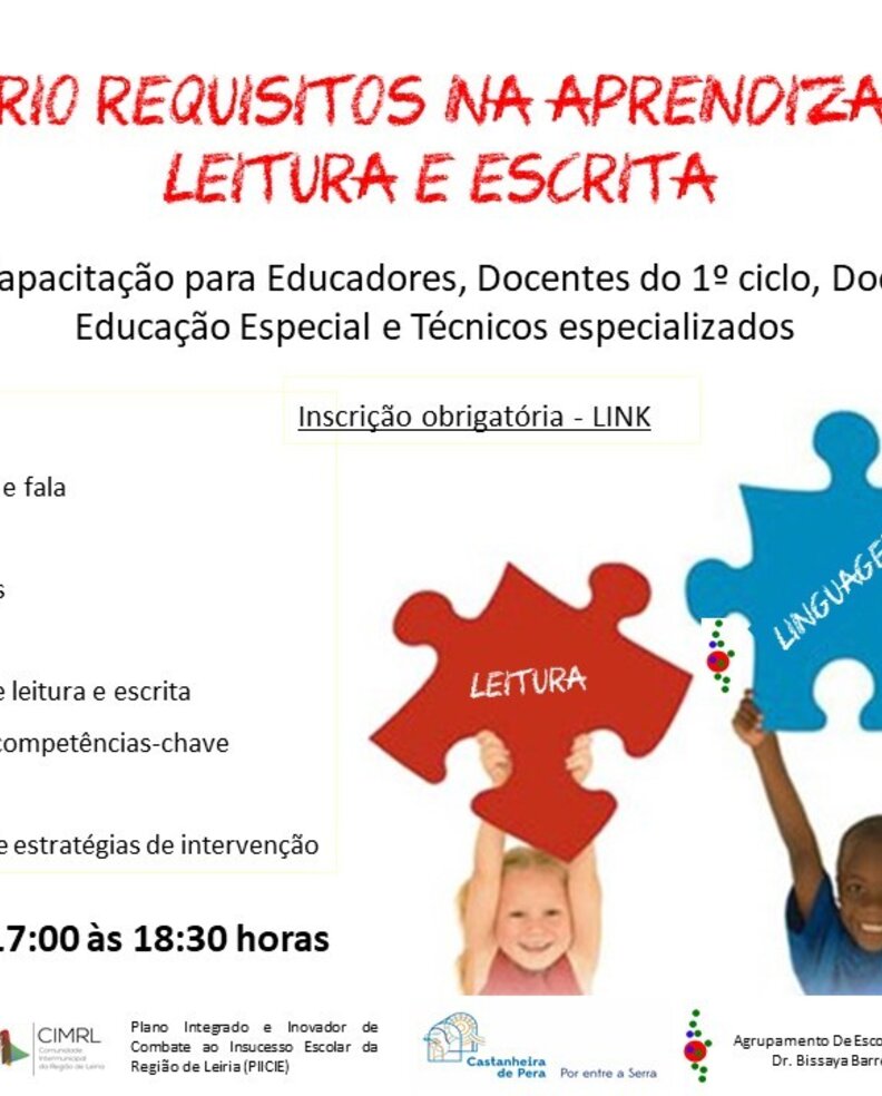 No âmbito do projeto da CIMRL, “Plano Integrado e Inovador de Combate ao Insucesso Escolar da Região de Leiria”, informamos que no próximo dia 26/02/2021 (sexta feira), entre as 17h00 e as 18h30, a Terapeuta da Fala, contratada pelo município de Castanheira de Pera e integrada nas Equipas Multidisciplinares PIICIE, em colaboração com o Serviço de Psicologia e a Terapeuta da Fala do Agrupamento de Escolas Dr. Bissaya Barreto, dinamizam uma ação de capacitação/webinar, denominada "Requisitos na aprendizagem da leitura e escrita”, dirigida a Educadores de Infância, Docentes e Técnicos Especializados.