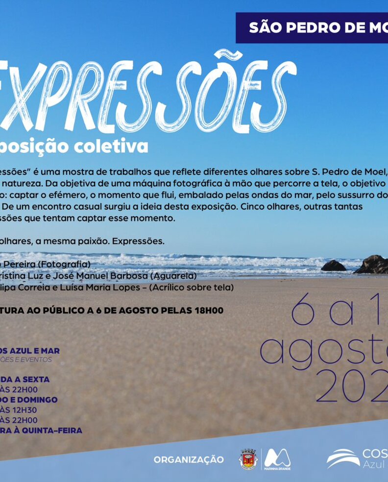 Na Sala Azul, no rés-do-chão, vai estar patente a Exposição Coletiva “Expressões”. Trata-se de uma mostra de trabalhos que reflete diferentes olhares sobre S. Pedro de Moel, o mar e a natureza. Da objetiva de uma máquina fotográfica à mão que percorre a tela, o objetivo é o mesmo: captar o efémero, o momento que flui, embalado pelas ondas do mar, pelo sussurro do vento. De um encontro casual surgiu a ideia desta exposição. Cinco olhares, outras tantas expressões que tentam captar esse momento.