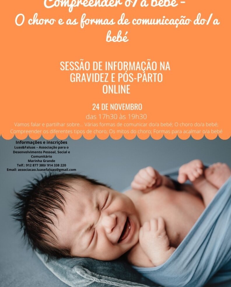 Na sessão - "Compreender o/a bebé - O choro e as formas de comunicação do/a bebé", vão ser abordados os seguintes temas: