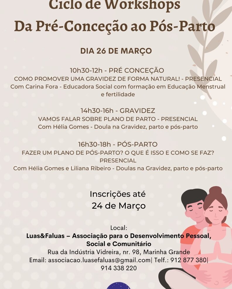 A Associação Luas&Faluas, de mãos dadas com o Projeto Cíclica, vai promover o Ciclo de Workshops (presenciais) - Da Pré-Conceção ao Pós-Parto, no próximo dia 26 de Março.