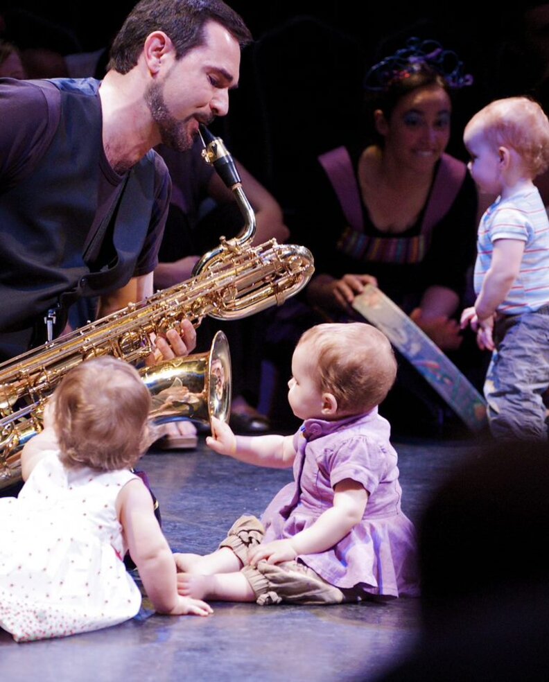 Quem os bebés gostam de ver dançar é a bailarina Inesa. O Paulo, com os outros músicos, prefere cantar e tocar para ver os duetos dos bebés com a bailarina. Mas a Clara Leão um dia, ao espreitar os Concertos para Bebés, imaginou que todos poderiam dançar naquela arena de fraldas. Olhou com mais atenção os dedos dos saxofonistas e dos bebés, deixou-se embalar pelo fole do acordeão enquanto as mães embalavam o mais precioso dos públicos, e nasceu um concerto novo. Quem vai dançar afinal?