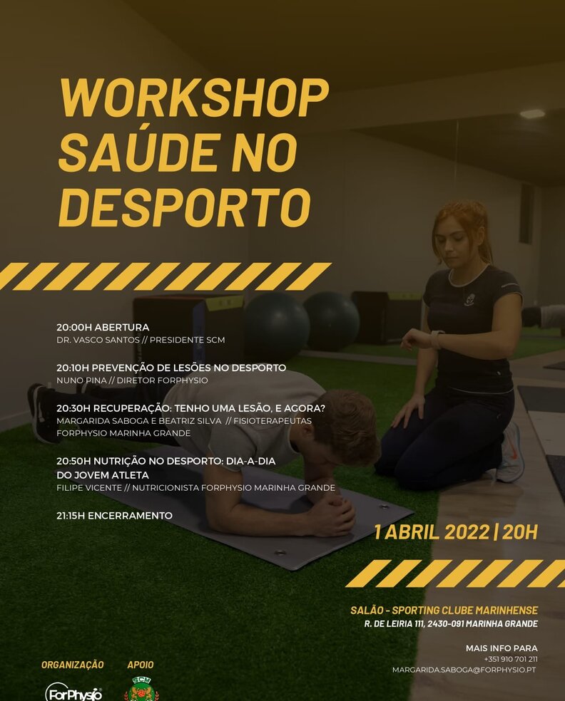 Dia 1 de Abril de 2022, pelas 20h00, realiza-se um Workshop "Saúde no Desporto", no salão do Sporting Clube Marinhense, com entrada gratuita.