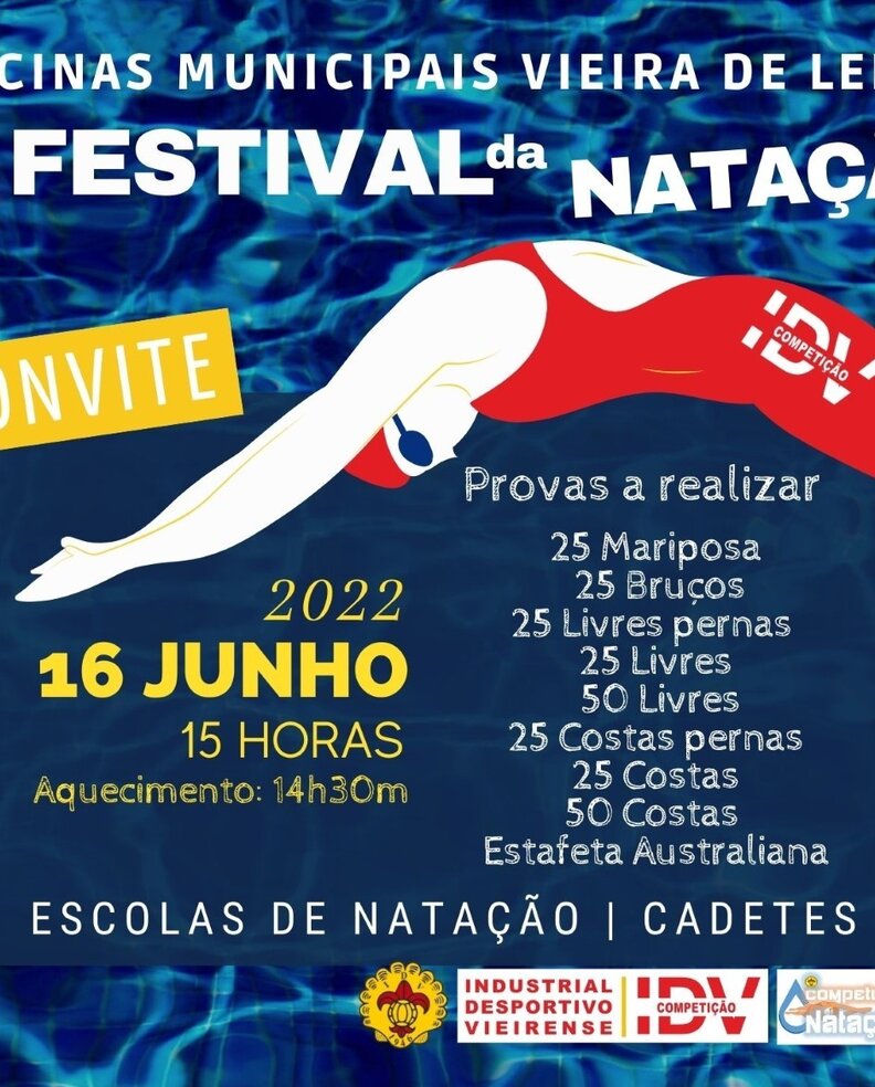 5º Festival de Natação, Organizado pelo Industrial Desportivo Vieirense, que decorrerá no dia 16 de Junho, nas Piscinas Municipais de Vieira de Leiria, pelas 15h00.