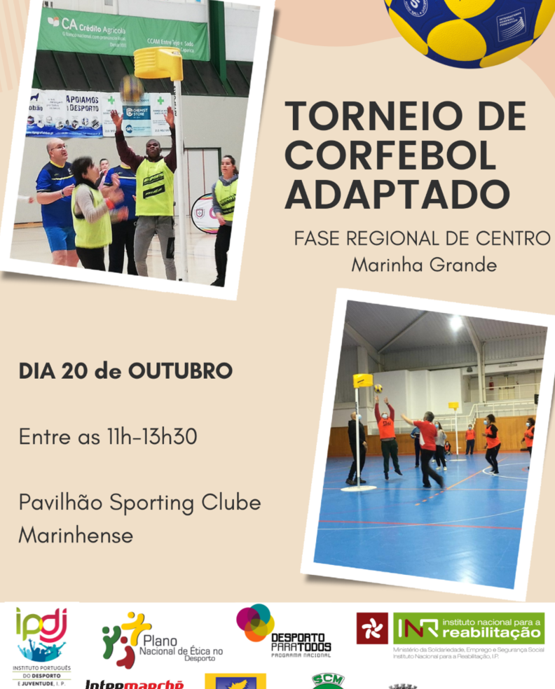 Na próxima quinta-feira, 20 de outubro, a Federação Portuguesa de Corfebol vai realizar a fase regional de Corfebol Adaptado para atletas com deficiência intelectual com as equipas do distrito de Leiria, no Pavilhão do Sporting Clube Marinhense.