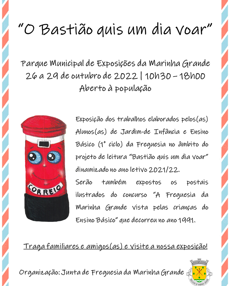 A mostra consiste na exibição dos trabalhos elaborados pelos(as) alunos(as) de Jardim-de Infância e Ensino Básico (1º ciclo) da Freguesia, no âmbito do projeto de leitura “Bastião quis um dia voar”, dinamizado no ano letivo 2021/22.