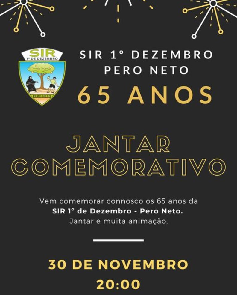 Tem lugar a 30 de novembro, pelas 20h, o jantar comemorativo dos 65 anos da SIR 1º de Dezembro - Pero Neto.
