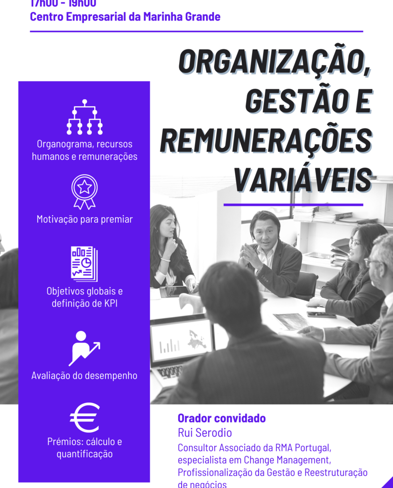 No dia 23 de novembro, entre as 17h00 e as 19h00, a CEFAMOL, com o apoio da RMA Portugal, realiza a sessão «Organização, gestão e remunerações variáveis», no Centro Empresarial da Marinha Grande.