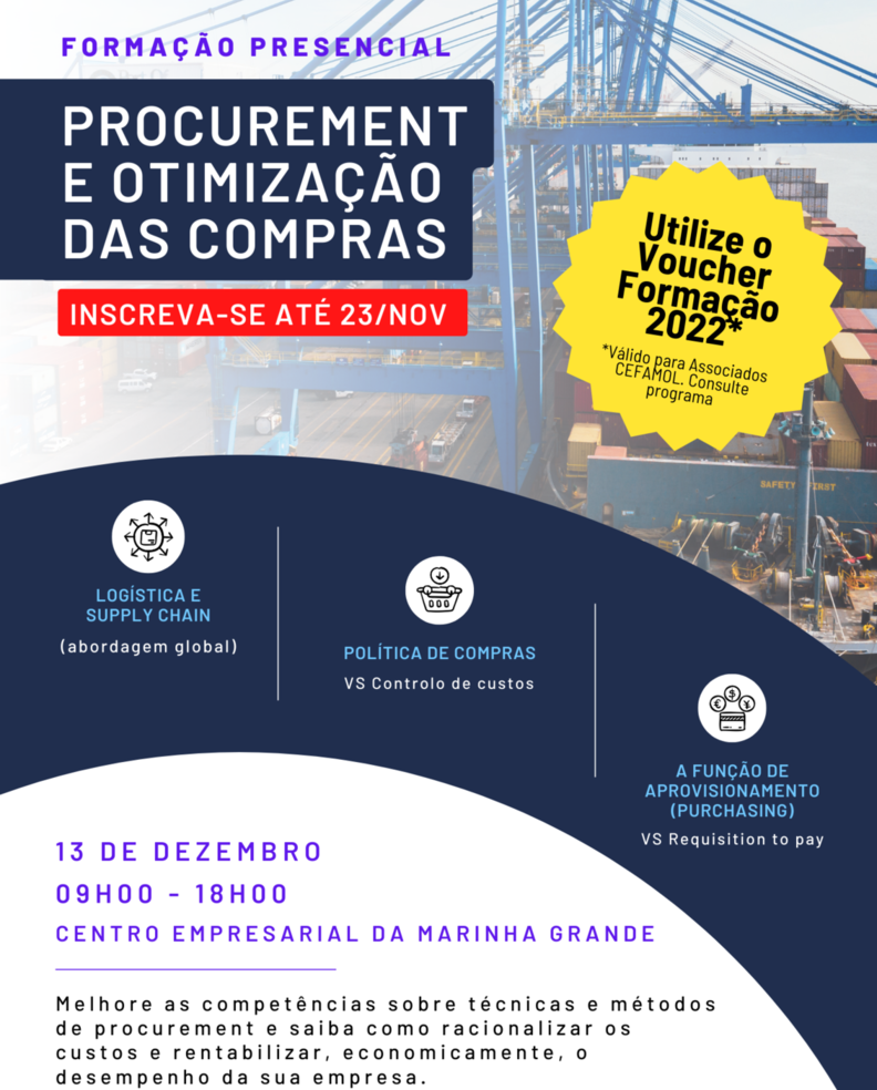 No dia 13 de dezembro, decorre a Formação Presencial de "Procurement e Otimização das Compras", entre as 9h e as 18h, no Centro Empresarial da Marinha Grande.