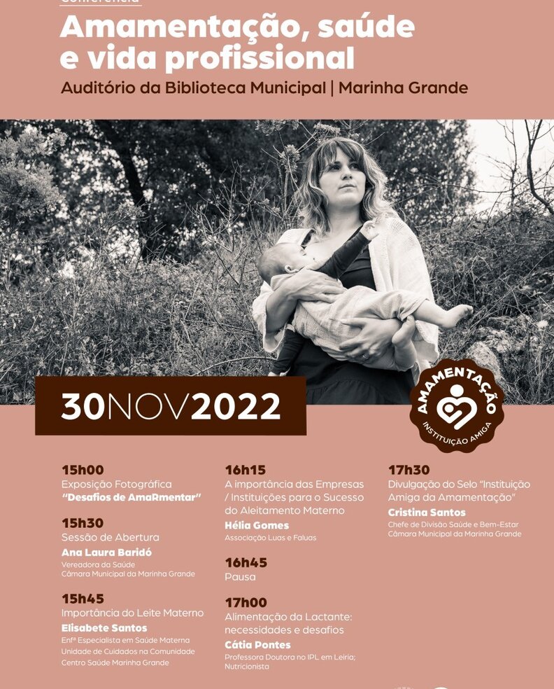 No dia 30 de novembro (quarta-feira), pelas 15h00, no Auditório da Biblioteca Municipal da Marinha Grande, realiza-se a conferência "Amamentação, Saúde e Vida Profissional”, numa organização da Câmara Municipal, Unidade de Cuidados na Comunidade (UCC) e Associação Luas e Faluas.
