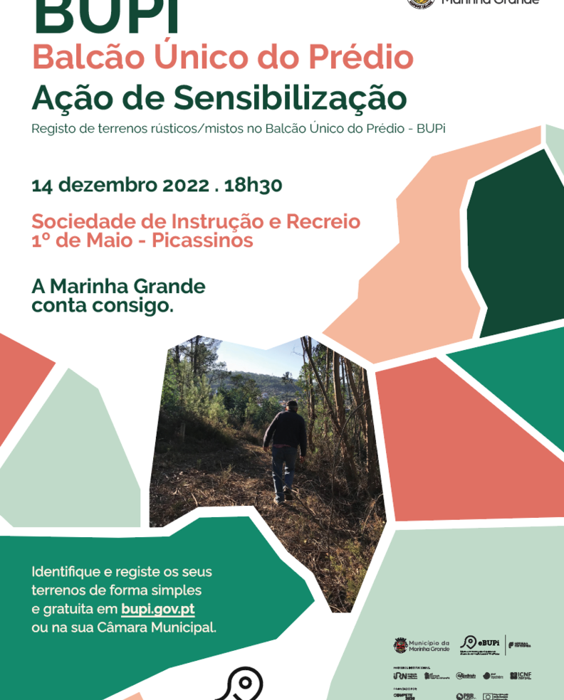 A Câmara Municipal da Marinha Grande realiza uma ação de sensibilização sobre o registo de terrenos rústicos/mistos no Balcão Único do Prédio - BUPi”, no dia 14 de dezembro, pelas 18h30, na Sociedade de Instrução e Recreio 1 de Maio, em Picassinos, cuja entrada é livre, no âmbito do projeto cofinanciado pelo CENTRO2020, Portugal 2020 e União Europeia, através do Fundo Social Europeu (FSE).